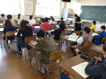 5年1組では社会科「日本の国土と人々のくらし」「世界から見た日本」のテストをしていました。大陸や地形を表した世界地図、緯線や経線がひかれた地球儀、いろいろな国の国旗から多様な角度で出題されています。難しい問題もありましたが、児童は粘り強く解いていました。