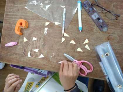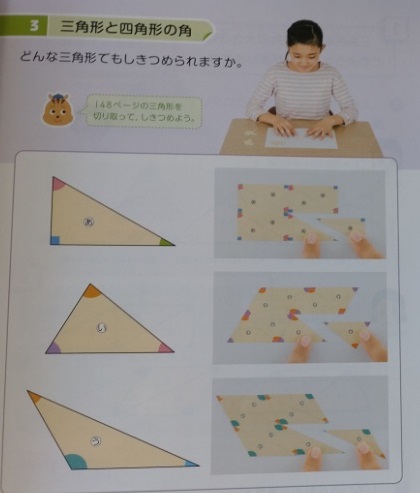 できた児童は、算数科「図形の合同と角」の単元で、三角形の内角の性質について考えるために、教科書についている三角形をミシン目に沿って切り抜いていました。