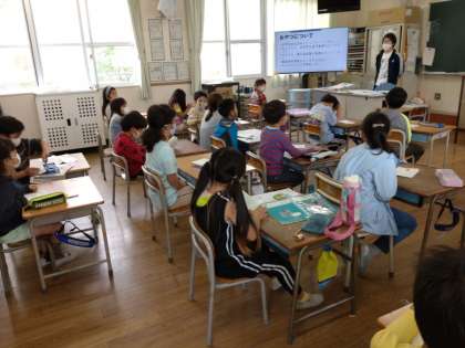 1・2年生は、5月11日(水)天王寺動物園へ遠足に行きます。2年1組では、えんそくのしおりが配られ、先生から説明を受けていました。児童が特に興味があるのは、やはりおやつについてのようです。しおりには、「もちもの」の欄に「おやつ(200えんまで)」とあります。「200円のおやつを2つ買ってもいいのですか?」など、自分の要望も絡めた質問もありました。