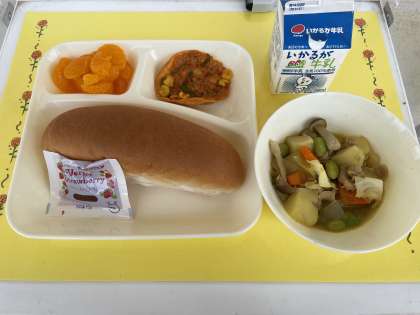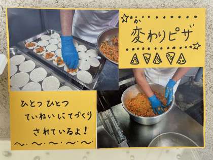 5月11日(水)の給食は、コッペパン・いちごジャム・牛乳・豚肉と野菜のカレースープ・変わりピザ・みかん(缶)です。変わりピザは、児童は一口で食べますが、1枚1枚多様な具をていねいに乗せて焼き上げています。味わって食べてほしいと思います。