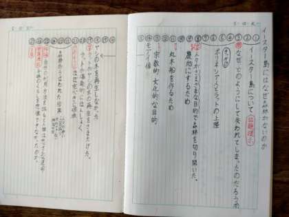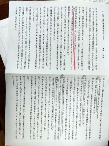 6年生は国語科で「イースター島にはなぜ森林がないのか」について学習しています。本時では、各段落のつながりについて、さらに、文章全体の構成について考えていました。この文章には、全部で27つの形式段落があります。全体の構成が分かるように、ノートにまとめていました。