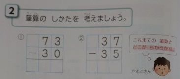 本時で学ぶ筆算は、十の位が「3−3」「5−5」など、ひき算すると「0」になることや、ひく数の一の位に「0」であることが大きな違いです。