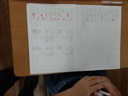 2年生では算数科で「ひき算」を学習しています。1組では、前時までに学んだひき算の筆算と、本時で学ぶ筆算とでは、計算の仕方にどのような違いがあるのか考えました。