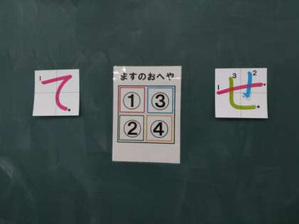 1年生では国語科の時間に、ひらがな「て」「せ」を学んでいました。「て」は1画ですが、曲がり具合が1年生にとって難しいでしょうか。「せ」については、2画目と3画目の書き始めの位置がわかりにくいでしょうか。黒板には「1の部屋」「2の部屋」……が示されています。何の部屋から書き始めるのかしっかり確認したものと思われます。