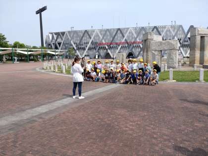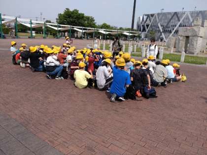 花園中央公園に着きました。少し暑いですが、みんな元気です。お茶を一口飲んで記念写真を撮って活動開始!