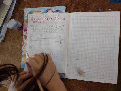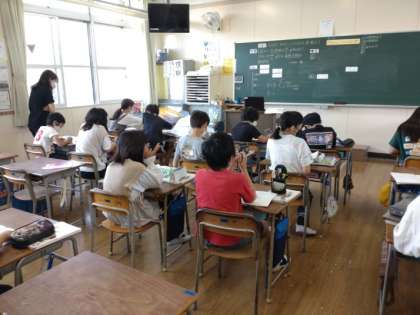 6年生では算数科で「分数のかけ算」の学習をしています。「1dlのペンキで屋根を4/5平方メートル塗れました。このペンキ1/3dlでは、屋根を何平方メートル塗れますか。」の問題で、式は「4/5×1/3」になる見通しです。その式になったわけを説明するのがめあてのようです。友だちの説明を見て「(1)(2)……」と番号を打っていき、どこがわからないのか話を整理していきました。学び合いで難問も理解できるようにがんばってほしいです。