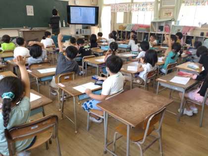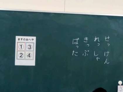 小さい「っ」「ゃ」「ゅ」「ょ」 公開日 2022/05/25 更新日 2022/05/25 お知らせ 1年生は国語科で拗音・促音(小さい「っ」「ゃ」「ゅ」「ょ」)について学習していました。先生から小さな「っ」を使った言葉を尋ねられ、「せっけん」「れっしゃ」「きっぷ」「ばった」次々に発表しました。続いて小さい「ゃ」を使った言葉もいくつも発表していました。 この後、ワークシートに書く練習をします。縦書きと横書きでは書く部屋が違うので気をつけてほしいです。 いいね(0)