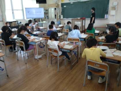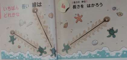 2年生は算数科で「長さを はかろう」を学習します。1組では、3匹のカメが砂浜を歩いていて、どのカメがいちばん長く進んだのかを比べます。身の回りの物を使って「いくつ分」なのかで表して比べます。気をつけるのは、同じものを使わなければいけないようです。