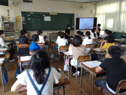 6年生は算数科で「分数のかけ算」の学習をしています。本時は「4/5×1/3」の計算の仕方について自分の考えを発表し合っていました。見通しでは最初に「分母どうし、分母どうしをかける」とありました。では、なぜそうなのでしょうか。なんとなく見通せても、説明すること、なぜなのか相手に理解してもらうことは難しいようです。児童は、鋭い質問も飛ぶ中、ノートに書かれた説明を必死で説明していました。