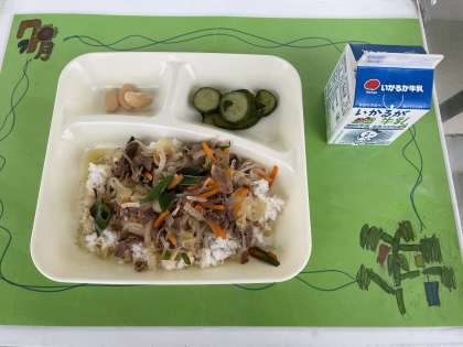 7月13日(水)の給食は、牛丼・牛乳・きゅうりのしょうがづけ・大福豆の煮物です。大福豆はインゲン豆の仲間で、筋肉を作るもととなるたんぱく質や、お腹の調子を整える働きがある食物繊維を多く含みます。ほとんどのインゲン豆が北海道で栽培されています。給食では、甘い味付けの煮物にしています。