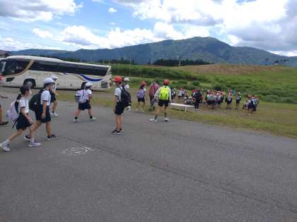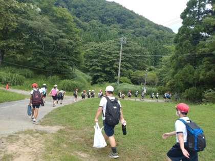 次は魚つかみです。避難訓練を兼ねて広場に集合しました。川へ移動します。