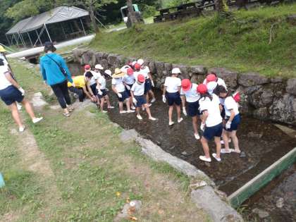 魚つかみ開始です。ヤマメやアマゴをつかみます。川の冷たい水に足をつけて、とても楽しそうです。