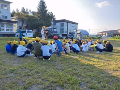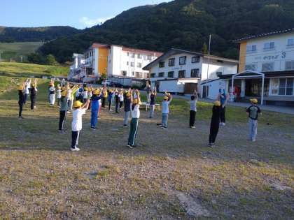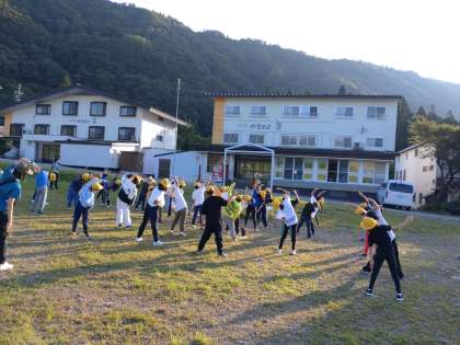 おはようございます。8月3日(水)朝の集いの様子です。まだ眠そうな児童もいますが、朝の体操で体を起こしています。