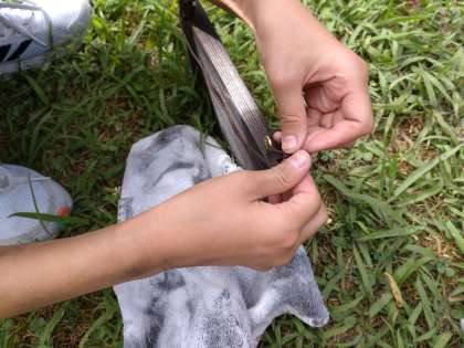 ヒートン(紐を通す金具)を2つつけて、飾れるようにします。