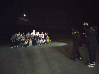 月をバックに学級写真を撮りました。何故か妖精も写っていました。ちなみに!勉強の神だそうです。