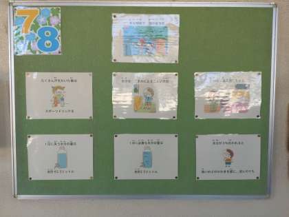 保健室横に掲示板に「水分補給で熱中症予防」という題で、水分補給することがなぜ大切なのか、そして、水分補給するために気をつけることについて絵入りで説明されていました。9月に入ると運動会の練習が始まりますが、まだまだ暑い日が続いていきます。こまめに水分補給させて熱中症に気をつけながら、この時期を乗り越えるようにしていきたいです。