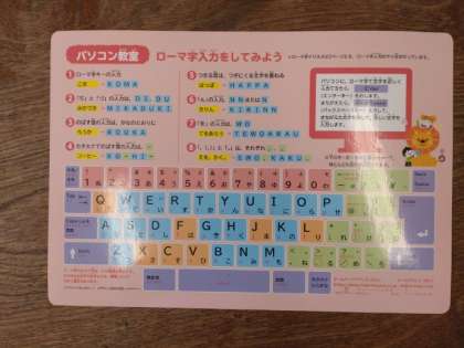 この練習帳には、パソコンのキーボードが描かれた下敷きが付録についています。ローマ字入力できるようになると、キーボードを打つのが速くなります。早くローマ字に慣れてほしいと思います。
