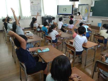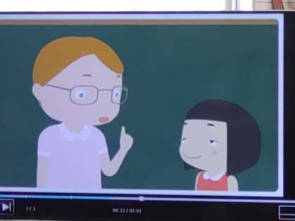 毎週水曜日、朝タイムで外国語活動に取り組んでいます。2年2組では、自分が外国の小学校に転校したときに、どのように自己紹介したらいいのか考えていました。「My name is ○○.」自分の名前の伝え方をすでに知っている児童が何人かいました。自分の誕生日、自分が好きなことなどもどのように伝えたらいいのか、子どもたちは知っていることを次々に発表していきました。