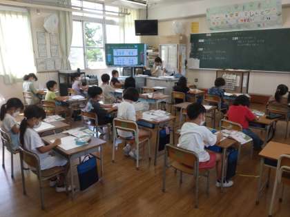 水のかさ 公開日 2022/08/31 更新日 2022/08/31 お知らせ 2年生は算数科で「水のかさ」を学習しています。1組では、次のような問題について考えていました。アとイの水筒に入っている水のかさを比べるのに、「アの水筒はコップで3杯、イの水筒はカップで4杯」なので、「4杯入るイの水筒の方がかさが大きい」とはならないようです。 コップ、または、カップ、同じ大きさの容器で何倍入るのかを比べなければいけないことに気づいていきました。 いいね(0)