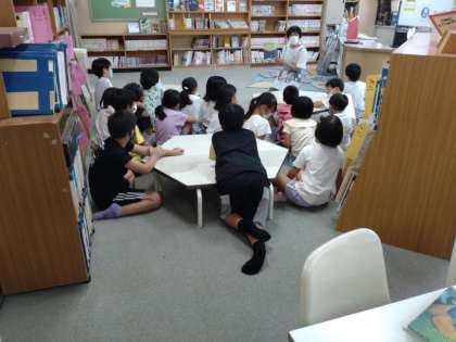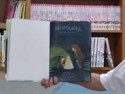 2年2組は、図書室で読書に取り組んでいました。図書館司書の先生から、貸し出しテーブルの前に集まるように声がかかりました。図書館司書の先生の読み聞かせが始まります。本の題名は「ぼくはうちゅうじん」です。みんな読み聞かせを楽しんでいました。
