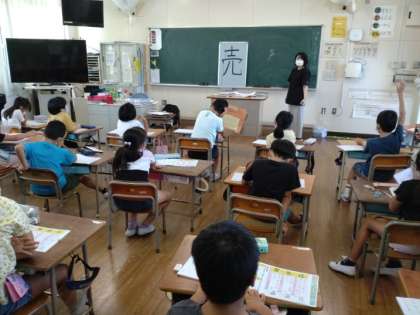 2年2組では国語科に新出漢字「近」「売」を学んでいました。「近」では「しんにょう」が難しいようです。「売」では、先生から「気をつけることは何でしょう?」と問われました。「『士』の下の部分を長くしない。」「『声』『読』も同じように気をつける。」などの意見がありました。また、このあと習う漢字「買」を取り上げ、「『ばいばい』を『買売』と間違えない。」という意見もありました。