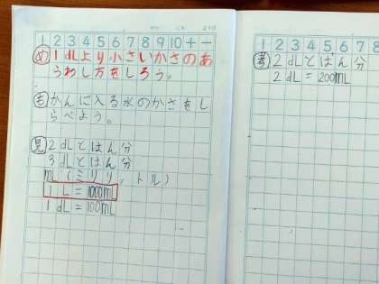 「ml」「dl」慣れなくて書きにくいですが、頑張って練習していました。