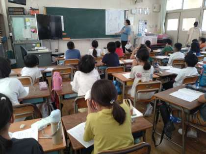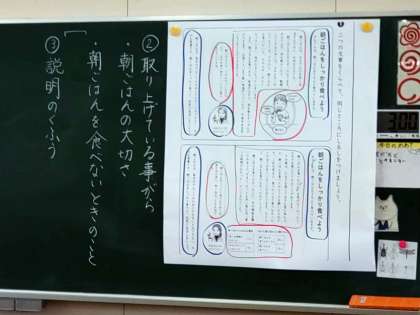 3年生は国語科で「書き手のくふうを考えよう」の学習をしています。2種類の保健だよりを読み比べて、同じところや違うところを探していました。3つの観点がありました。(1)伝えたいことは両者とも「朝ご飯をしっかり食べよう」のようです。(2)取り上げている事柄については選んでいる内容が両者で違っているようです。(3)説明の仕方の工夫でも絵や図の使い方など違っています。授業の最後に、自分がいいと思う保健だよりを選んでいました。