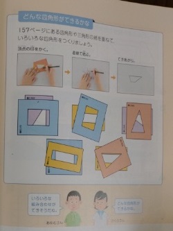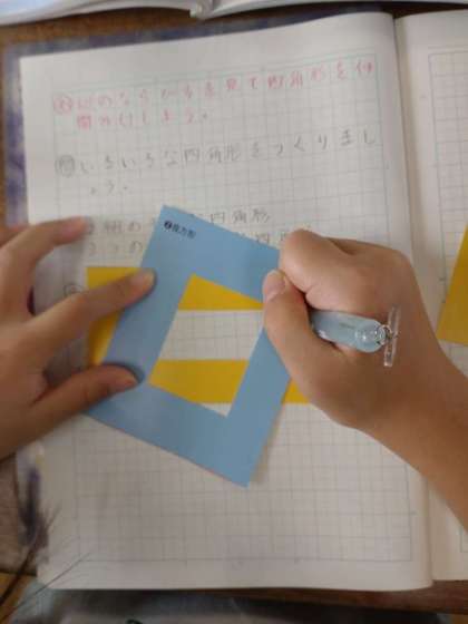 四角形や三角形を重ねて 公開日 2022/09/09 更新日 2022/09/09 お知らせ 4年生は算数科で「四角形」を学習していきます。本時では、いろいろな四角形や三角形を重ねてできる四角形について調べていきます。 児童はノートに次々といろんな形の四角形を描いていきました。いったん手を止めて、改めて四角形を見ていくと、いくつかの種類に分けられるようです。これからいろいろな四角形の性質について考えていきます。 いいね(0)