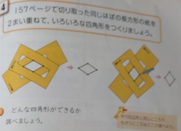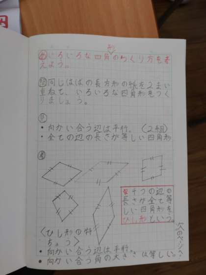 4年生は算数科で「四角形」を学習しています。おなじ幅の長方形の紙を2枚重ねてできる四角形について調べていくと、4つの辺の長さが等しい四角形ができました。角は90度ではないので正方形ではないようです。この図形を「ひし形」ということを知り、性質について見つけていきました。これまでいろいろな四角形が登場してきました。整理して覚えてほしいと思います。
