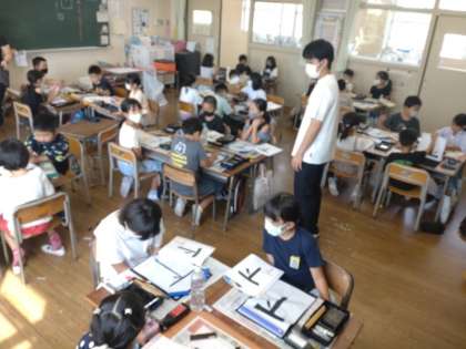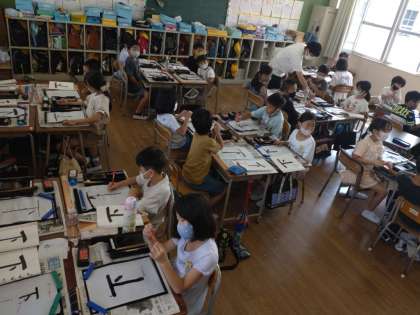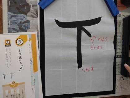 「下」 公開日 2022/09/15 更新日 2022/09/15 お知らせ 3年生は書写の時間に「下」の漢字を学習していました。めあては「たて画と点に気をつけてかく」です。まずは、試し書きです。教科書の手本と見比べながら、気をつけるところを赤で書き加えていました。慣れるまで、始筆を左斜め上からいれることに抵抗があるかもしれません。 グループで交流し合ったら、練習開始のようです。思うような清書が書けたでしょうか。 いいね(0)