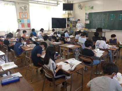 4年生は国語科で「一つの花」を学習しています。本時では、戦争中と十年後の「ゆみ子」の生活の様子を比べて、十年後の生活がどのように変わっていったのかを捉えていました。「ばくだんの音」と「ミシンの音」、「おいも・豆・かぼちゃ」と「魚・肉」など対になる言葉を取り出し、十年後の生活をまとめていました。「平和」という言葉がキーワードのようです。