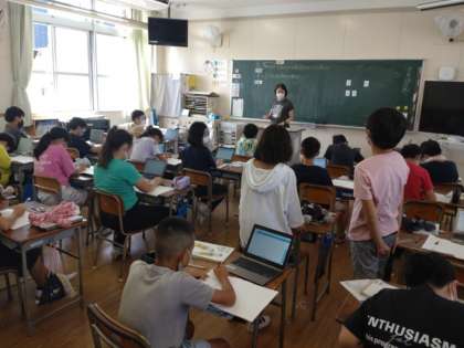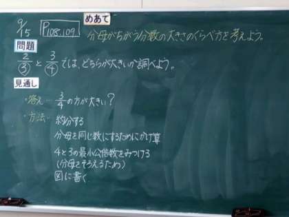 5年生は算数科で「分数のたし算・ひき算」を学習しています。1組では、「2/3と3/4とでは、どちらが大きい?」について考えていました。これまで「3/5と3/7」「1/5と4/5」分子や分母が同じ場合の大小は比べられます。今回の課題は、分子も分母も違う数です。