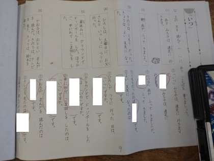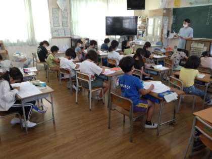 2年1組では国語科で、「いつ」「どこで」について問われる練習プリントに取り組んでいました。今、答え合わせをしていました。問題文から「いつ」「どこで」の部分を見つけ出して答えていました。できるだけ速く正確に「いつ」「どこで」の部分を見つけ出すことができれば、文章を読み取る力もさらについていくことでしょう。