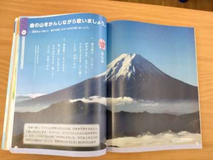 次は「ふじ山」です。教科書には頭を雲の上に出した富士山の写真が載っています。先生から「富士山について知っていることは?」と尋ねられ「日本一高い山」「火山」の答えがありました。富士山のイメージを曲に表すことができるでしょうか。
