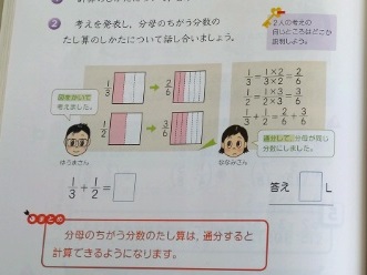 分母が違う分数のたし算 公開日 2022/09/21 更新日 2022/09/21 お知らせ 5年生は算数科で「分数のたし算やひき算」を学習しています。1組では次のような問題について考えていました。分母の違う分数のたし算の仕方について、いろいろな見通しを発表して、考えを交流していました。解き方はいろいろあるようですが、今まで習った学習を振り返りながら、どの考え方が最も簡単に解けるのか話し合っていました。 いいね(0)