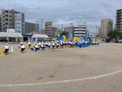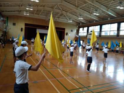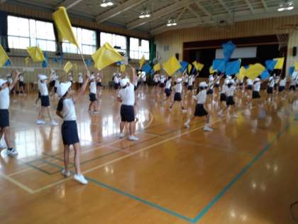 繋(つなぐ)〜人・心・未来〜 公開日 2022/09/22 更新日 2022/09/22 お知らせ 10月2日(日)の運動会まで、あと1週間余りになりました。開会式などの練習をする予定だった全体練習は、朝の集中豪雨により延期となりました。 その代わりに、5・6年生が1・2時限目に団体演技「繋(つなぐ)〜人・心・未来〜」の練習をしていました。大勢の仲間と動きを合わせて堂々と行進していました。フラッグを全体でフル姿もとてもきれいでした。5・6年生みんながつながっているようでした。 いいね(0)