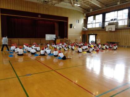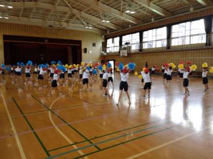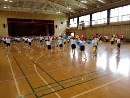 CHEERS!! 公開日 2022/09/22 更新日 2022/09/22 お知らせ 3時限目は、1・2年生が団体演技「CHEERS!!」の練習をしていました。「CHEERS」には「乾杯」「ありがとう」という意味があります。ポンポンを持った多くの子どもたちが、リズムに乗って飛び跳ね、乾杯をするときのようなうれしい気持ちを精一杯表しているようでした。 また、自分たちで動きを考えるフレーズがあるようです。グループで一所懸命話し合っていました。 いいね(0)