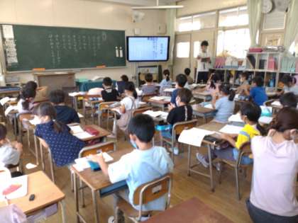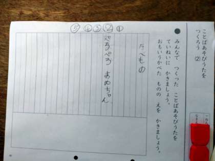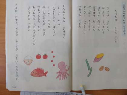 1年生は国語科で「ことばあそびうたを つくろう」の学習をしています。本時では、「ぱりぱり」「ぷりんぷりん」など思いつく音を発表し合いました。食べ物名とそれにふさわしい音を組み合わせて、ワークシートに書きこんでいきます。「やきにく やくやき」ではなくて「やきにくは、ジュージューかな。」などのやり取りがありました。「がりがりくん ガリガリ」「ぱきぱき おかし」など楽しい「ことばあそびうた」ができていました。