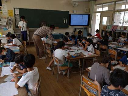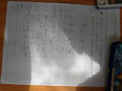 ことばあそびうたを つくろう 公開日 2022/09/29 更新日 2022/09/29 お知らせ 1年生は国語科で「ことばあそびうたを つくろう」の学習をしています。前時までに各グループで題を決めて「ことばあそびうた」を作りました。本時では、グループごとに歌を音読し合って、ふさわしい絵を描きます。題を「おみせやさん」にしたグループは「ちょきちょき さんぱつやさん」、題を「うみのいきもの」にしたグループは「ぷくぷく きんぎょ」など、工夫して音と結び付けて歌を考えていました。 いいね(0)