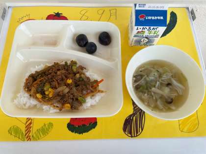 9月30日(金)の給食は、野菜たっぷりカラフルライス・キャベツときのこのスープ・ぶどう(巨峰)です。本日は学校給食献立コンクール優秀賞献立です。福島区吉野小学校5年2組の給食委員会が考えた作品です。運動や勉強を元気にがんばれるように、食欲が出るカラフルな色合いになるように考えられています。にんじんの赤・ピーマンや枝豆の緑・コーンの黄色の色合いがとてもきれいです。