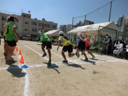 5年生は「バトンをつなげ 全力ダッシュで!」、6年生は「イチニカケル!!」の題でリレーを行いました。さすが高学年、力強い走りとスムーズなバトンパスでした。手に汗握る展開で、応援する側も引き込まれました。