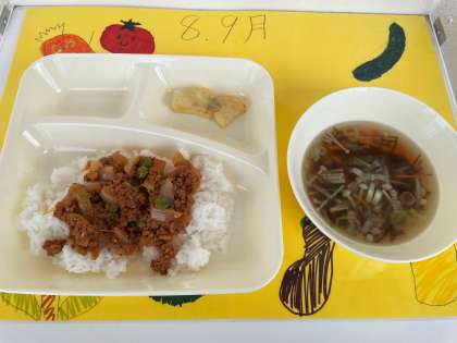 10月4日(火)の給食は、タコライス・牛乳・もずくのスープ・焼きじゃがです。タコライスは沖縄県で人気の料理です。牛ひき肉・豚ひき肉などを炒めて味付けした具をご飯にかけて食べます。沖縄の伝統的な料理は、琉球料理と呼ばれています。豚肉や豆腐、昆布などの海藻、野菜を使った料理が多く、栄養バランスに優れています。今日まで気温が高い予報ですが、沖縄料理を食べて暑さを吹き飛ばしました。