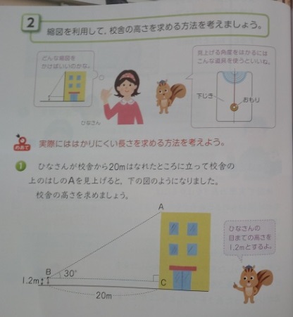 6年生は算数科で「拡大図と縮図」を学習しています。本時では次の問題について考えていました。縮図図を利用して校舎の高さを概則します。「縮尺」の意味を復習した後で、縮尺1/200の縮図をかいて考えます。辺BCの長さは10cm、角Bは30°、これだけでは三角形ABCはかけません。もう1か所、角か辺の値がわからないでしょうか?そういえば、校舎の高さは垂直に測るので……。