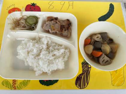 10月5日(水)の給食は、ごはん・牛乳・豚肉のねぎじょうゆ焼き・ふきよせ煮・きゅうりともやしの甘酢あえです。「ふきよせ」は、秋から冬のはじめにかけて使われる料理の名前です。「風にふきよせられた落ち葉を思わせるように、秋の味覚を盛り上げた料理」のことで、秋にたくさん獲れて美味しくなる栗、銀杏、芋、野菜、きのこなどが使われます。今回は、鶏肉・サトイモ・玉ねぎ・にんじん・レンコン・こんにゃくなど、具だくさんで美味しかったです。