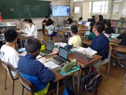 どうして大量の食糧を輸入してるのか 公開日 2022/10/05 更新日 2022/10/05 お知らせ 5年生は社会科で「これからの食糧生産」を学習しています。「主な食糧の輸入先と輸出先の割合」の資料を見ながら、先生から「日本はどうして大量の食糧を輸入しているのだろう。」と問われました。タブレットのチームズには、社会科ワークシートが入っています。そこに課題、予想や調べることを入力していました。児童は、これまで社会科で習った知識も活用しながら課題について考えていました。 いいね(0)