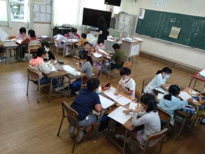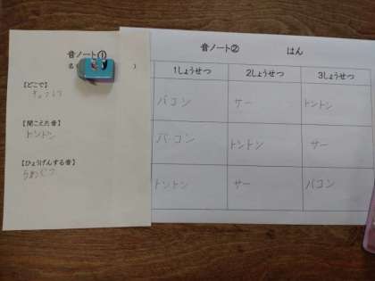 2年生は音楽科で「みの まわりの 音を 声で あわらして、音楽を つくる」取り組みもしています。2組では、前時につけた音ノート(いつ・どこで・きこえた音)をグループで組み合わせて、ひとつの新しい音楽をつくり出していました。「バシャバシャ」「ザー」(プールの音)などを組み合わせてみると、結構まとまった音楽に仕上がるものです。発表会が楽しみです。