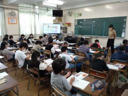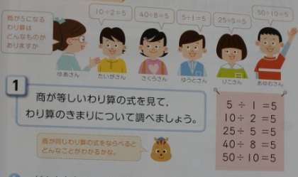 わり算のきまり 公開日 2022/10/07 更新日 2022/10/07 お知らせ 4年生は算数科で「わり算」について学習しています。これまでわり算の筆算の仕方について考えてきましたが、本時では「わり算のきまり」について考えていきます。「5÷1=5」と「10÷2=5」このように商が等しいわり算の式を見て、きまりをみつけます。今回は難しかったようで、児童は悩ましい顔をしています。2つの式を縦に並べて見比べると、何かが見えてきたでしょうか。 いいね(0)