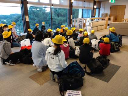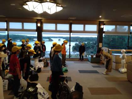 宿舎「みち潮」に到着しました。オーシャンビューの素晴らしい景色です。開舎式でお世話になる宿舎の方にごあいさつしました。宿舎の説明はペッパーくんから聞きました。