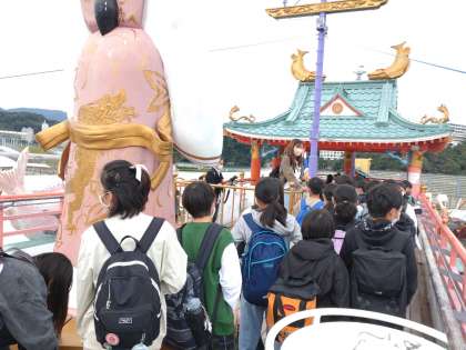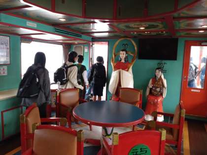 遊覧船に乗って鳥羽湾めぐりです。遊覧船の中は、まるで竜宮城のようです。さあ出港です。景色を楽しんでほしいです。