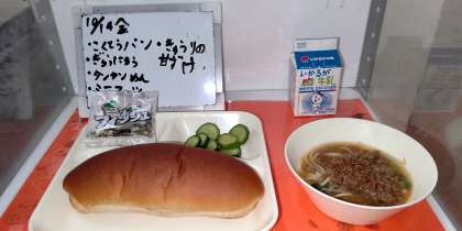 10月14日(金)の給食は、黒糖パン・牛乳・タンタンメン・きゅうりの甘酢づけ・ミニフィッシュです。タンタンメンは、中国四川料理を代表する麺料理の一つです。給食のタンタンメンは、チンゲンサイなどの野菜や麺が入った汁面の上に、味付けした肉みそをのせて食べます。野菜や肉がたっぷり、具材の美味しさを引き立てる味噌味、タンタンメンは麺料理の中でも人気上位メニューの一つです。